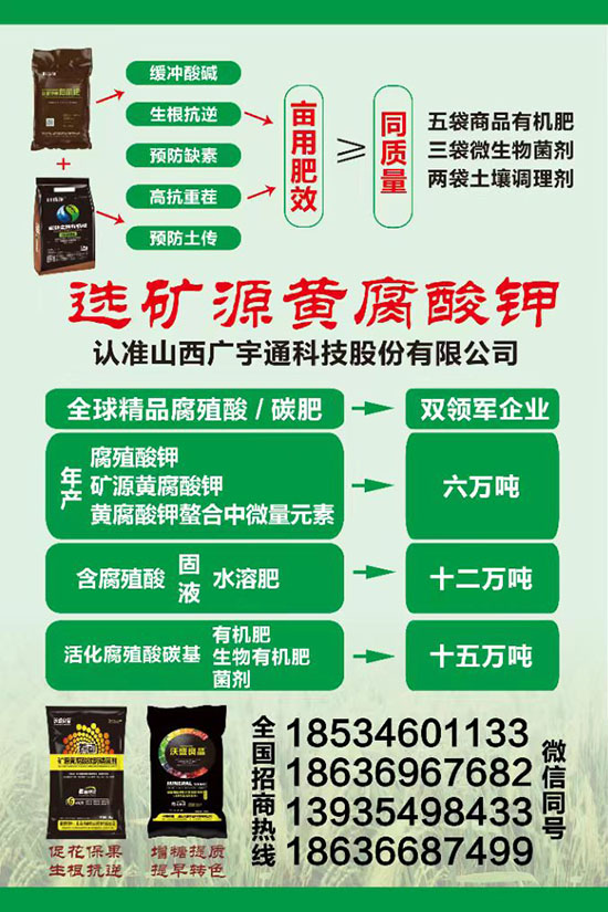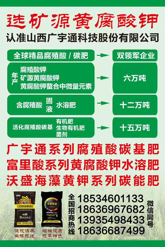 山西廣宇通科技股份有限公司,地處太行呂梁兩大山脈對沖地帶一一靈石,立足優(yōu)質的高膠質煤炭伴生腐植酸資源,在中國腐植酸協(xié)會、中國腐植酸檢測中心、中科院山西煤化所、中國熱科院、山西農大,太原理工大等二十余所科研院所的專家教授指導合作下,引進國外腐植酸新型生產工藝,深入研究腐植酸應用及延深制品工藝,目前在職教授六名,碩究生以上