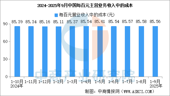 1-9月份,規(guī)模以上工業(yè)企業(yè)每百元營業(yè)收入中的成本為85.56元,同比增加0.18元;每百元營業(yè)收入中的費用為8.36元,同比減少0.16元。