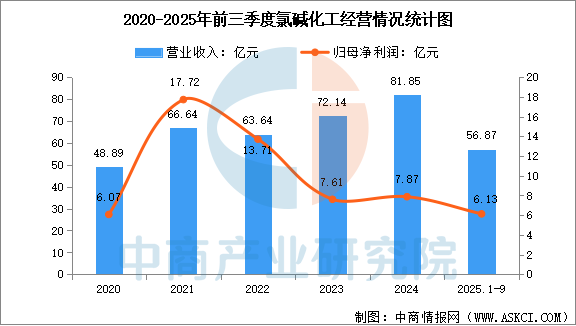 2025年前三季度,氯堿化工實現(xiàn)營業(yè)收入56.87億元,同比下降5.36%,歸母凈利潤6.13億元,同比上升1.02%。上半年,公司燒堿收入12.92億元,占比36.12%,氯產(chǎn)品收入10.53億元,占比29.42%,聚氯乙烯收入8.777億元,占比24.53%。