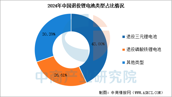 中商產(chǎn)業(yè)研究院發(fā)布的《2025-2030全球及中國(guó)鋰離子電池回收行業(yè)研究及十四五規(guī)劃分析報(bào)告》顯示,按電池材料分類,退役鋰電池可分為退役三元鋰電池、退役磷酸鐵鋰電池及其他類型的退役鋰電池,2024年其退役數(shù)量分別為19.57萬(wàn)噸、12.11萬(wàn)噸和13.83萬(wàn)噸,分別占比43.00%、26.61%、30.39%。