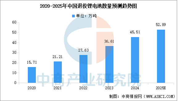 退役鋰電池指由于衰退或損壞而不再適合其原始應(yīng)用的鋰電池。近年來,隨著中國(guó)內(nèi)地電動(dòng)汽車行業(yè)快速發(fā)展及消費(fèi)電子產(chǎn)品更新?lián)Q代加快,中國(guó)退役鋰電池?cái)?shù)量快速增長(zhǎng)。中商產(chǎn)業(yè)研究院發(fā)布的《2025-2030全球及中國(guó)鋰離子電池回收行業(yè)研究及十四五規(guī)劃分析報(bào)告》顯示,中國(guó)退役鋰電池?cái)?shù)量由2020年的15.71萬(wàn)噸增至2024年的45.51萬(wàn)噸,復(fù)合年增長(zhǎng)率為30.5%。中商產(chǎn)業(yè)研究院分析師預(yù)測(cè),2025年中國(guó)退役鋰電池?cái)?shù)量將達(dá)到52.89萬(wàn)噸。