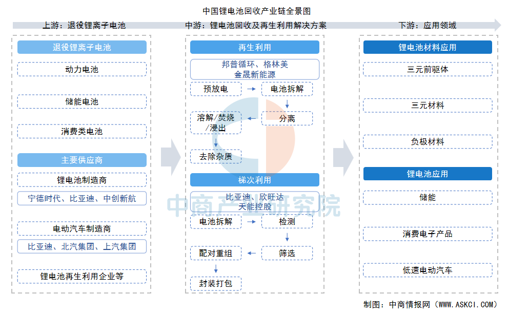 鋰電池回收是一個(gè)集技術(shù)、資本、政策于一體的戰(zhàn)略性新興產(chǎn)業(yè),對(duì)于推動(dòng)新能源汽車行業(yè)的可持續(xù)發(fā)展至關(guān)重要。鋰離子電池回收產(chǎn)業(yè)鏈由上游的退役鋰離子電池供應(yīng)、中游的電池回收與再利用解決方案,以及下游的鋰離子電池應(yīng)用和電池材料應(yīng)用構(gòu)成。
