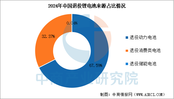 動(dòng)力電池及消費(fèi)電子產(chǎn)品為退役鋰電池的主要來源。動(dòng)力電池作為電動(dòng)汽車的核心零部件,當(dāng)電池性能不再滿足車輛的功率要求時(shí),電池將被更換或退役。退役鋰電池的另一個(gè)主要來源為消費(fèi)電子產(chǎn)品,如智能手機(jī)、筆記本計(jì)算機(jī)、平板計(jì)算機(jī)及數(shù)碼相機(jī),消費(fèi)電子產(chǎn)品的高滲透率及快速更新頻率產(chǎn)生大量退役鋰電池。中商產(chǎn)業(yè)研究院發(fā)布的《2025-2030全球及中國(guó)鋰離子電池回收行業(yè)研究及十四五規(guī)劃分析報(bào)告》顯示,2024年退役動(dòng)力電池和退役消費(fèi)類電池分別占中國(guó)退役鋰電池總量的67.59%和32.37%。