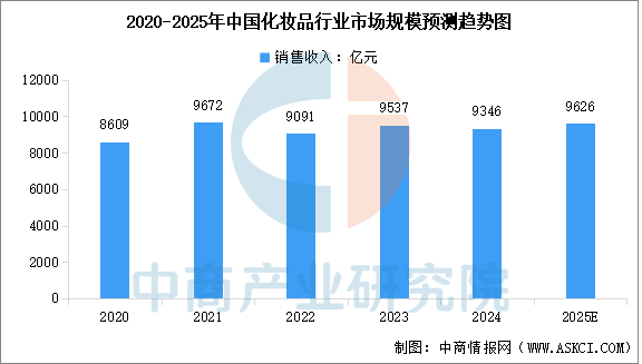 受經(jīng)濟(jì)環(huán)境影響,消費(fèi)者決策趨于理性,化妝品品牌紛紛聚焦高性價比產(chǎn)品,致使2024年中國化妝品市場規(guī)模同比略有收縮。中商產(chǎn)業(yè)研究院發(fā)布的《2025-2030年中國化妝品市場競爭分析及投資咨詢報告》顯示,中國化妝品行業(yè)市場規(guī)模從2020年的8609億元增長至2024年的9346億元,年均復(fù)合增長率達(dá)2.1%。中商產(chǎn)業(yè)研究院分析師預(yù)測,2025年中國化妝品行業(yè)市場規(guī)模將達(dá)到9626億元。