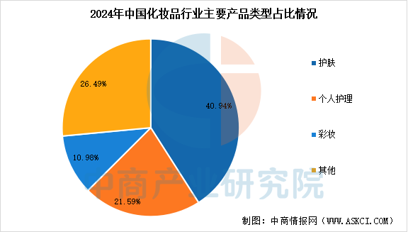 中商產(chǎn)業(yè)研究院發(fā)布的《2025-2030年中國化妝品市場競爭分析及投資咨詢報告》顯示,中國化妝品市場中,護(hù)膚品占比最大,2024年市場規(guī)模為3826億元,占比40.94%。其次是個人護(hù)理產(chǎn)品和彩妝產(chǎn)品,2024年市場規(guī)模分別為2018億元和1026億元,分別占比21.59%和10.98%
