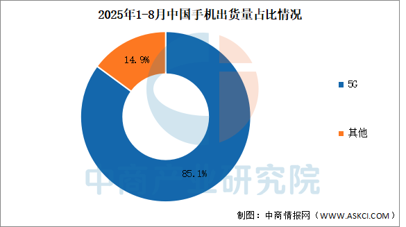 目前市場仍以5G手機為主,2025年1-8月,5G手機出貨量1.63億部,同比下降1.0%,占同期手機出貨量的85.1%。