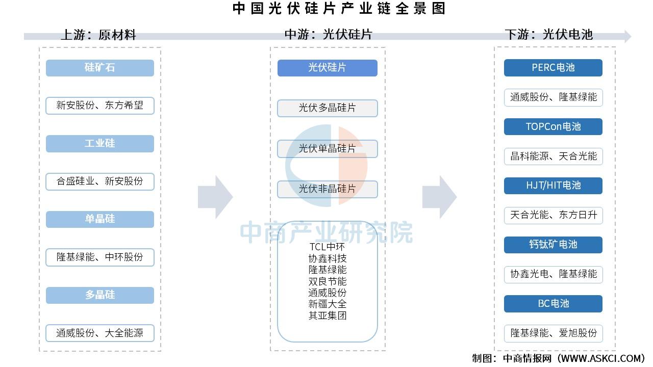光伏硅片產(chǎn)業(yè)鏈上游為原材料,包括硅礦石、工業(yè)硅、單晶硅、多晶硅等;中游為光伏硅片,可分為光伏多晶硅片、光伏單晶硅片、光伏非晶硅片;下游為光伏電池,包括PERC電池、TOPCon電池、HJT/HIT電池、鈣鈦礦電池、BC電池。
