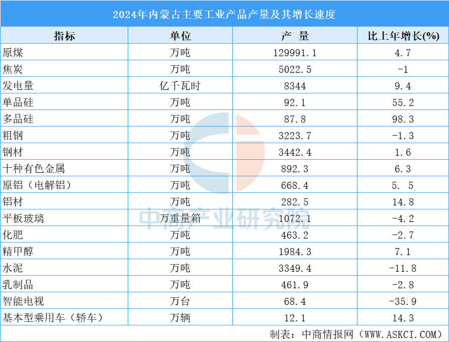 2024年全年內蒙古全部工業(yè)增加值比上年增長6.7%。分門類看,采礦業(yè)增長4.7%,制造業(yè)增長9.3%,電力、熱力、燃氣及水生產(chǎn)和供應業(yè)增長8.1%。全年規(guī)模以上工業(yè)中,煤炭開采和洗選業(yè)比上年增長5.1%,食品制造業(yè)增長4.5%,石油、煤炭及其他燃料加工業(yè)增長7.6%,化學原料和化學制品制造業(yè)增長7.5%,非金屬礦物制品業(yè)增長1.3%,有色金屬冶煉和壓延加工業(yè)增長12.8%,專用設備制造業(yè)下降2.9%,電氣機械和器材制造業(yè)增長41.3%,計算機、通信和其他電子設備制造業(yè)增長58.6%,電力、熱力生產(chǎn)和供應業(yè)增長8.2%。