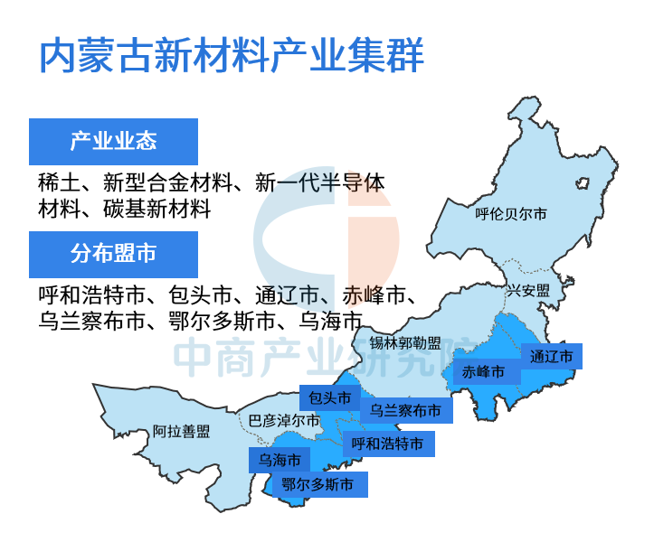 產(chǎn)業(yè)布局:新材料產(chǎn)業(yè)集群以呼和浩特市、包頭市、通遼市、赤峰市、烏蘭察布市、鄂爾多斯市、烏海市為重點(diǎn),大力發(fā)展稀土、新型合金材料、新一代半導(dǎo)體材料、碳基新材料產(chǎn)業(yè)。