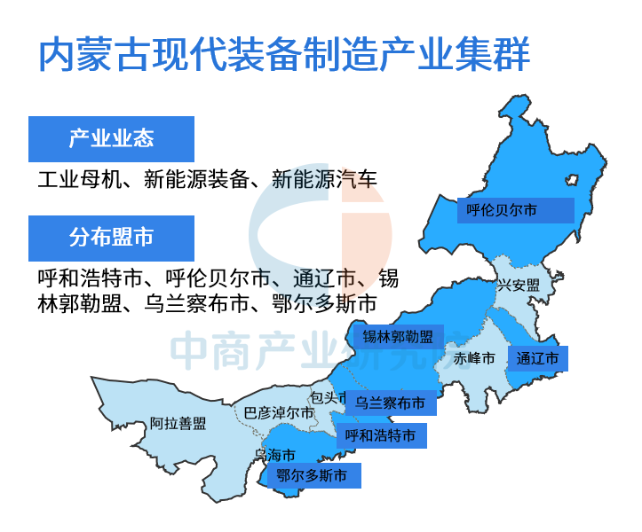 產(chǎn)業(yè)布局:內(nèi)蒙古現(xiàn)代裝備制造產(chǎn)業(yè)以呼和浩特市、呼倫貝爾市、通遼市、錫林郭勒盟、烏蘭察布市、鄂爾多斯市為重點(diǎn),大力發(fā)展工業(yè)母機(jī)、新能源裝備、新能源汽車。