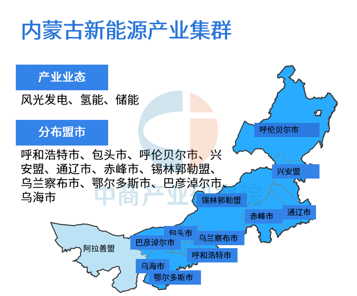 產(chǎn)業(yè)布局:新能源產(chǎn)業(yè)集群以呼和浩特市、包頭市、呼倫貝爾市、興安盟、通遼市、赤峰市、錫林郭勒盟、烏蘭察布市、鄂爾多斯市、巴彥淖爾市、烏海市為重點(diǎn),大力發(fā)展風(fēng)光發(fā)電、氫能、儲(chǔ)能產(chǎn)業(yè)。