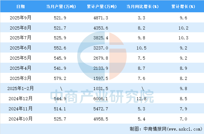 中商情報(bào)網(wǎng)訊:據(jù)中商產(chǎn)業(yè)研究院數(shù)據(jù)庫,2025年9月全國農(nóng)用氮、磷、鉀化學(xué)肥料當(dāng)月產(chǎn)量與去年同期相比增長。2025年9月全國農(nóng)用氮、磷、鉀化學(xué)肥料產(chǎn)量為521.9萬噸,同比增長3.3%。2025年1-9月全國農(nóng)用氮、磷、鉀化學(xué)肥料產(chǎn)量4871.3萬噸,同比增長9.6%。