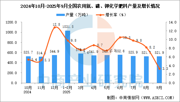 2025年9月全國農(nóng)用氮、磷、鉀化學(xué)肥料產(chǎn)量增長情況