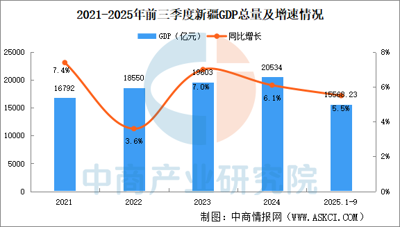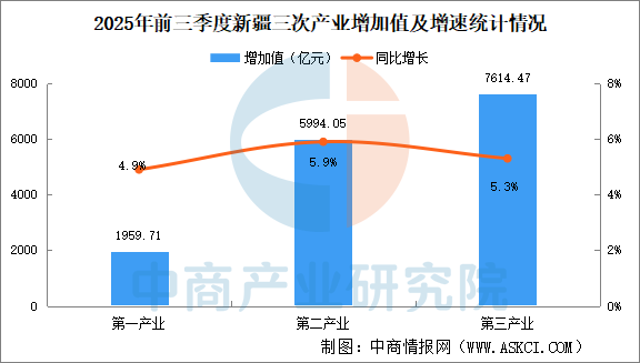 中商情報網(wǎng)訊:前三季度穩(wěn)就業(yè)穩(wěn)經(jīng)濟政策舉措接續(xù)發(fā)力,主要宏觀指標總體平穩(wěn),新疆經(jīng)濟運行保持穩(wěn)中有進態(tài)勢,高質(zhì)量發(fā)展取得積極成效。根據(jù)地區(qū)生產(chǎn)總值統(tǒng)一核算結(jié)果,前三季度,新疆地區(qū)生產(chǎn)總值15568.23億元,按不變價格計算,同比增長5.5%。其中:第一產(chǎn)業(yè)增加值1959.71億元,增長4.9%;第二產(chǎn)業(yè)增加值5994.05億元,增長5.9%;第三產(chǎn)業(yè)增加值7614.47億元,增長5.3%。