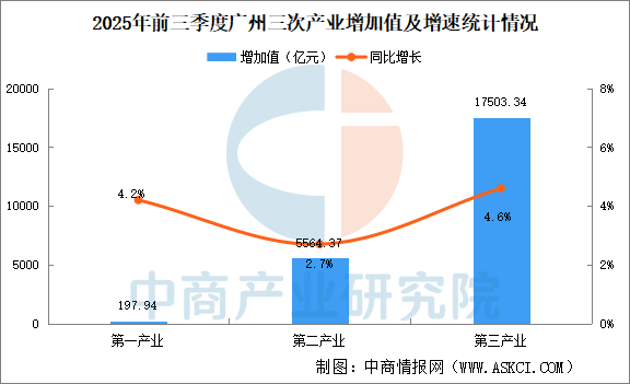 中商情報(bào)網(wǎng)訊:前三季度,廣州經(jīng)濟(jì)呈現(xiàn)穩(wěn)中有進(jìn)、進(jìn)中提質(zhì)的發(fā)展態(tài)勢。根據(jù)廣東省地區(qū)生產(chǎn)總值統(tǒng)一核算結(jié)果,2025年前三季度,廣州市地區(qū)生產(chǎn)總值23265.65億元,按不變價(jià)格計(jì)算,同比增長4.1%。其中,第一產(chǎn)業(yè)增加值197.94億元,增長4.2%;第二產(chǎn)業(yè)增加值5564.37億元,增長2.7%;第三產(chǎn)業(yè)增加值17503.34億元,增長4.6%。