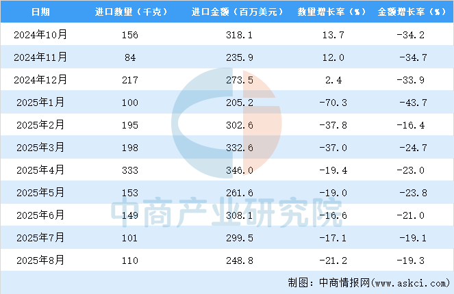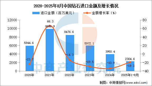 從金額方面來看,數(shù)據(jù)顯示,2025年1-8月中國鉆石進口金額2304.6百萬美元,同比下降19.3%。