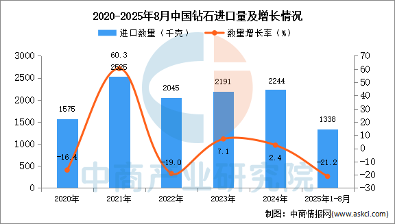 中商情報網(wǎng)訊:據(jù)中商產(chǎn)業(yè)研究院數(shù)據(jù)庫顯示,2024年中國鉆石進口量2244萬噸,同比增長2.4%。最新數(shù)據(jù)顯示,2025年1-8月中國鉆石進口量1338萬噸,同比下降21.2%。