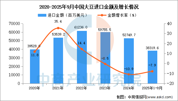從金額方面來看,數(shù)據(jù)顯示,2025年1-9月中國大豆進口金額38319.6百萬美元,同比下降7.9%。