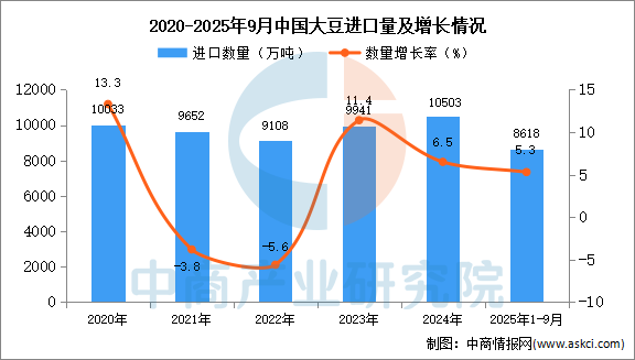 中商情報網(wǎng)訊:據(jù)中商產(chǎn)業(yè)研究院數(shù)據(jù)庫顯示,2024年中國大豆進口量10503萬噸,同比增長6.5%。最新數(shù)據(jù)顯示,2025年1-9月我國大豆累計進口量8618萬噸,同比增長5.3%。