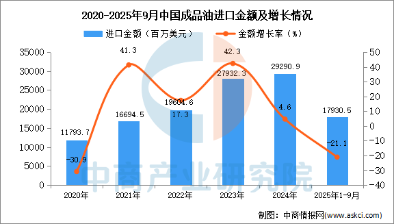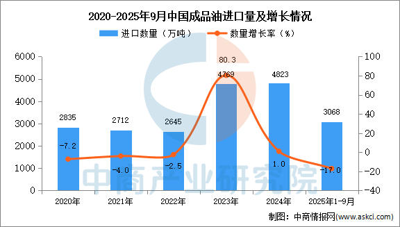 2025年9月中國(guó)成品油進(jìn)口量及金額增長(zhǎng)情況