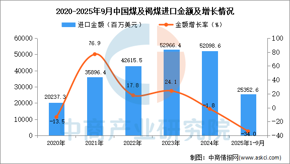 2025年9月中國煤及褐煤進口量及金額增長情況