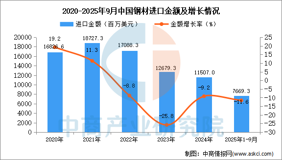 從金額方面來看,數(shù)據(jù)顯示,2025年1-9月我國鋼材累計進口金額7669.3百萬美元,同比下降11.6%。