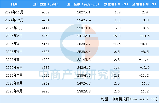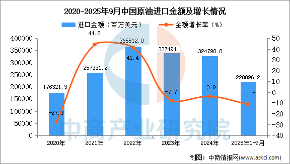 從金額方面來看,數(shù)據(jù)顯示,2025年1-9月我國原油累計進口金額220896.2百萬美元,同比下降11.2%。