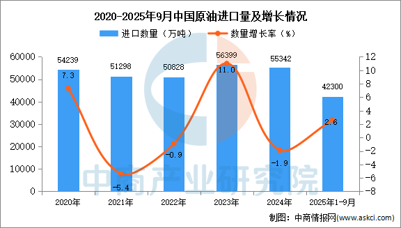 中商情報網(wǎng)訊:據(jù)中商產(chǎn)業(yè)研究院數(shù)據(jù)庫顯示,2024年中國原油進口量55342萬噸,同比下降1.9%。最新數(shù)據(jù)顯示,2025年1-9月我國原油累計進口量42300萬噸,同比增長2.6%。