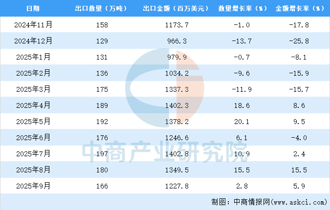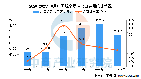 2025年9月中國航空煤油出口量及金額增長情況