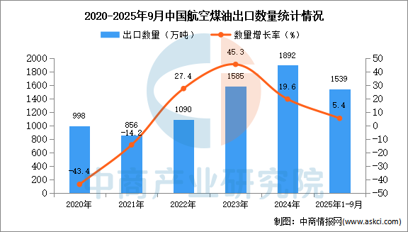 中商情報網(wǎng)訊:據(jù)中商產(chǎn)業(yè)研究院數(shù)據(jù)庫顯示,2024年我國航空煤油的出口量1892萬噸,同比增長19.6%。最新數(shù)據(jù)顯示,2025年1-9月中國航空煤油出口量1539萬噸,同比增長5.4%。