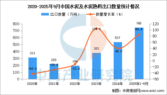 中商情報(bào)網(wǎng)訊:據(jù)中商產(chǎn)業(yè)研究院數(shù)據(jù)庫顯示,2024年我國水泥及水泥熟料的出口量537萬噸,同比增長40%。最新數(shù)據(jù)顯示,2025年1-9月中國水泥及水泥熟料出口量745萬噸,同比增長84.4%。