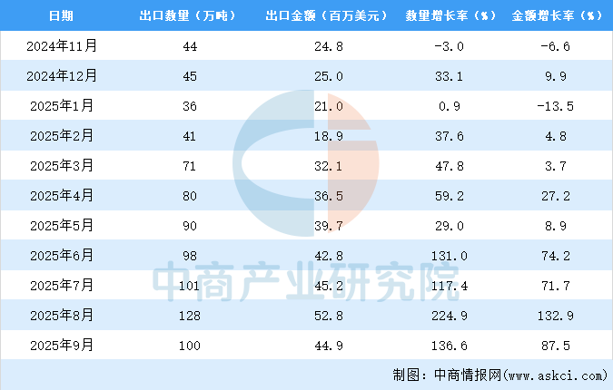 2025年9月中國水泥及水泥熟料出口量及金額增長情況