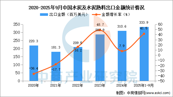 從金額方面來看,數(shù)據(jù)顯示,2025年1-9月中國水泥及水泥熟料出口金額333.9百萬美元,同比增長41.5%。