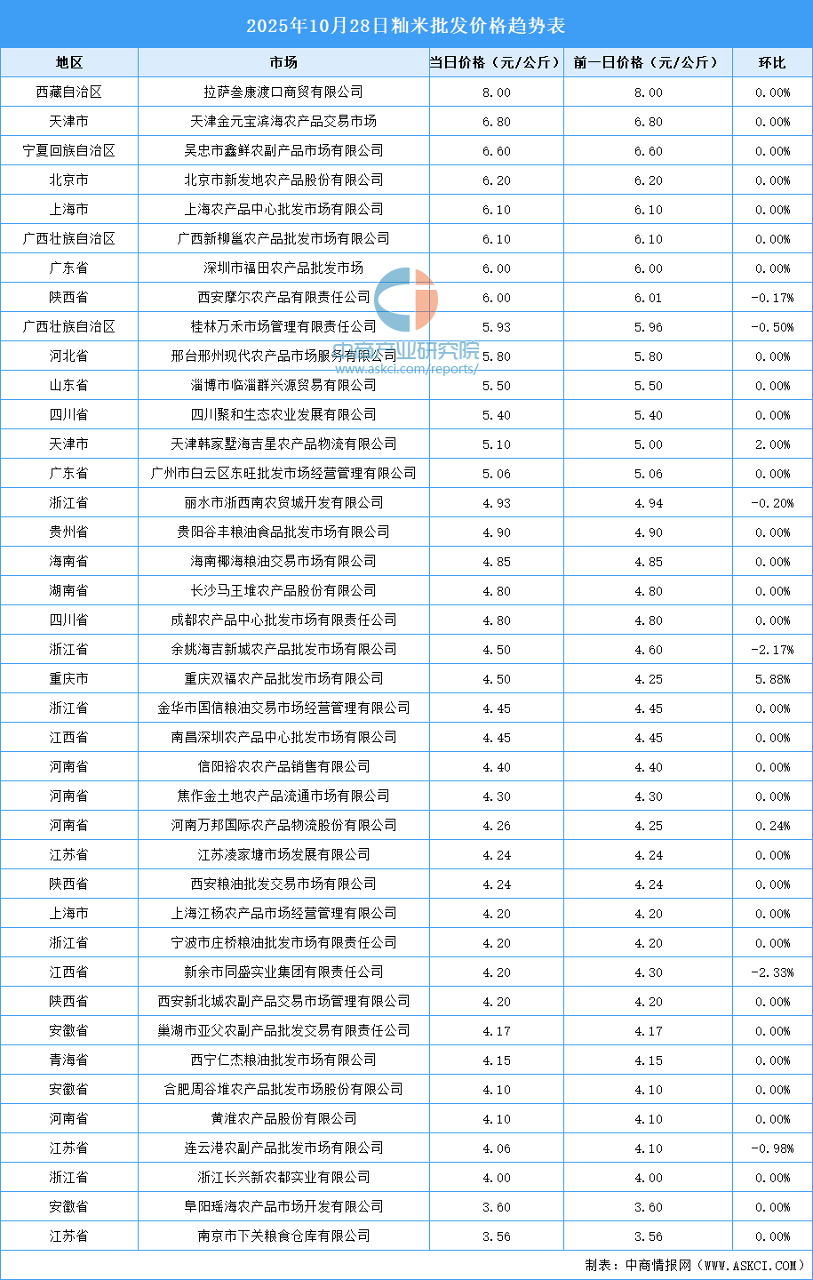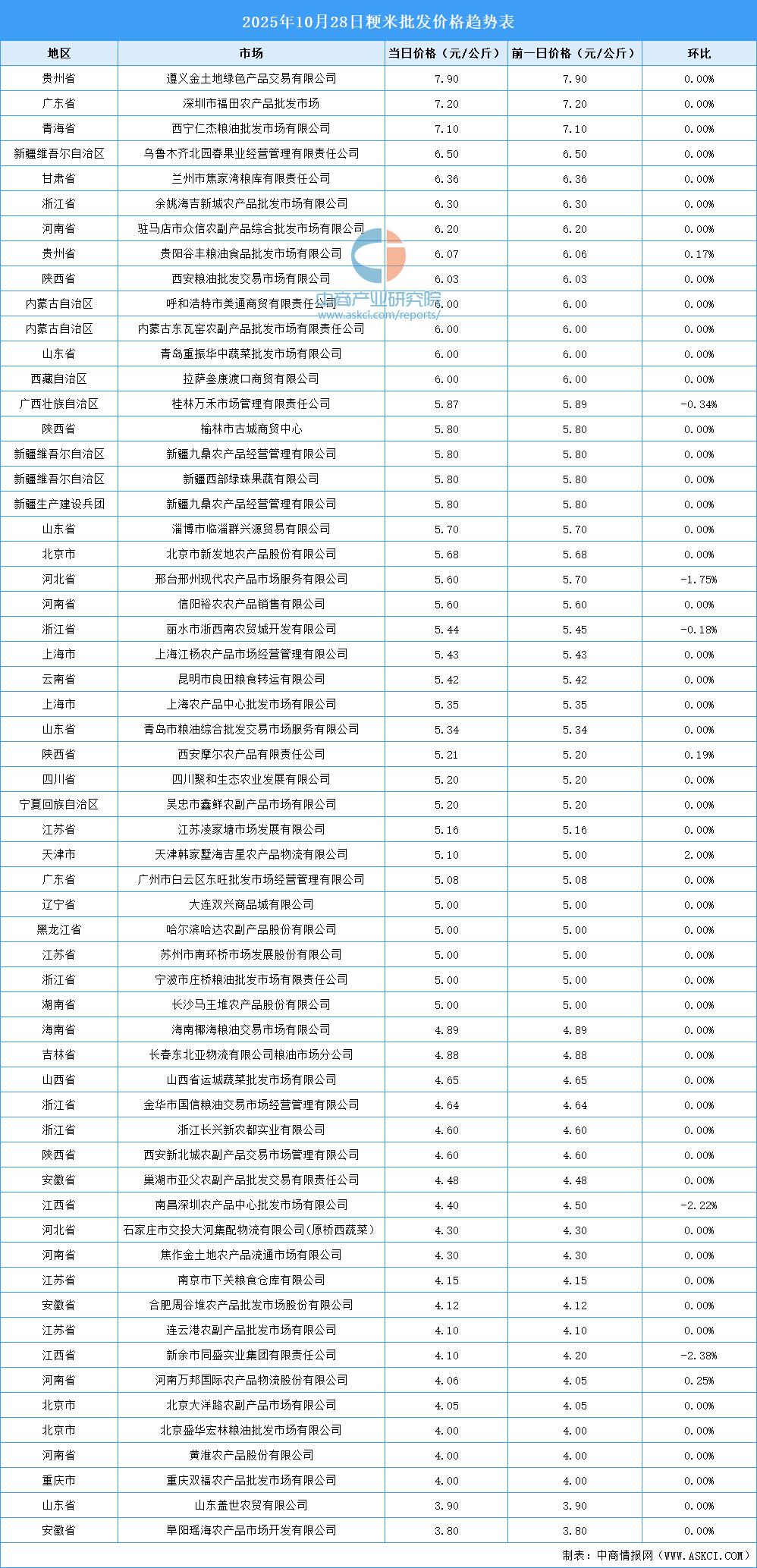 中商情報網(wǎng)訊:最新數(shù)據(jù)顯示:10月28日,全國粳米當(dāng)日均價為5.22元/公斤,秈米當(dāng)日均價4.92元/公斤。其中,粳米價格最高的遵義金土地綠色產(chǎn)品交易有限公司,當(dāng)日價格為7.90元/公斤,環(huán)比持平。秈米價格最高的市場是拉薩叁康渡口商貿(mào)有限公司,當(dāng)日價格為8.00元/公斤,環(huán)比持平。以下是2025年10月28日全國大米價格趨勢表詳情: