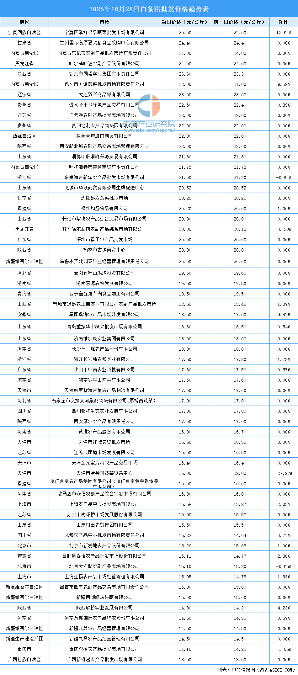 中商情報網(wǎng)訊:最新數(shù)據(jù)顯示:10月28日全國白條豬平均價格為18.47元/公斤。其中,白條豬價格最高的市場是寧夏四季鮮果品蔬菜批發(fā)市場有限公司,當日價格為25.00元/公斤,環(huán)比上漲13.64%。白條豬價格最低的是廣西新柳邕農(nóng)產(chǎn)品批發(fā)市場有限公司,當日價格為13.60元/公斤,環(huán)比持平。