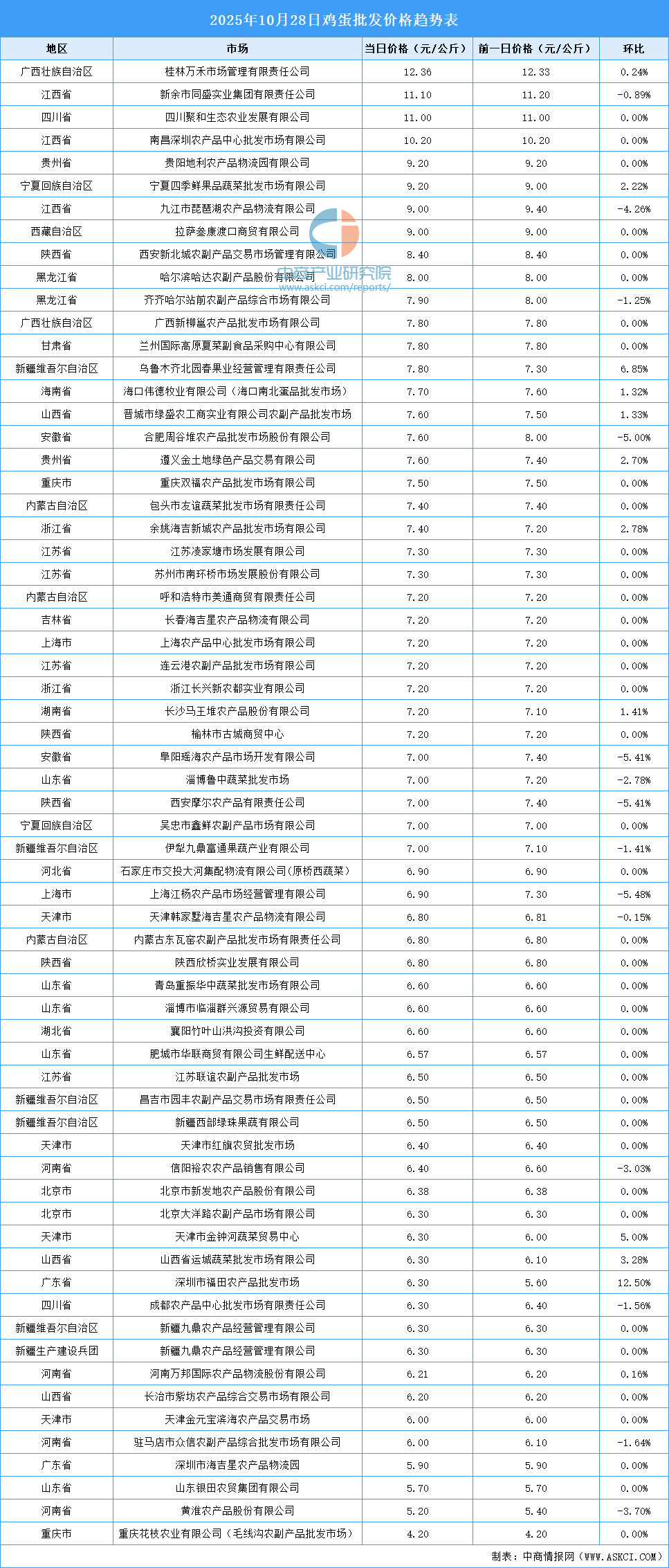 中商情報網(wǎng)訊:最新數(shù)據(jù)顯示:10月28日全國雞蛋平均價格為7.24元/公斤。其中,雞蛋價格最高的市場是桂林萬禾市場管理有限責任公司,當日價格為12.36元/公斤,環(huán)比上漲0.24%。雞蛋價格最低的市場是重慶花枝農(nóng)業(yè)有限公司(毛線溝農(nóng)副產(chǎn)品批發(fā)市場),當日價格為4.20元/公斤,環(huán)比持平。