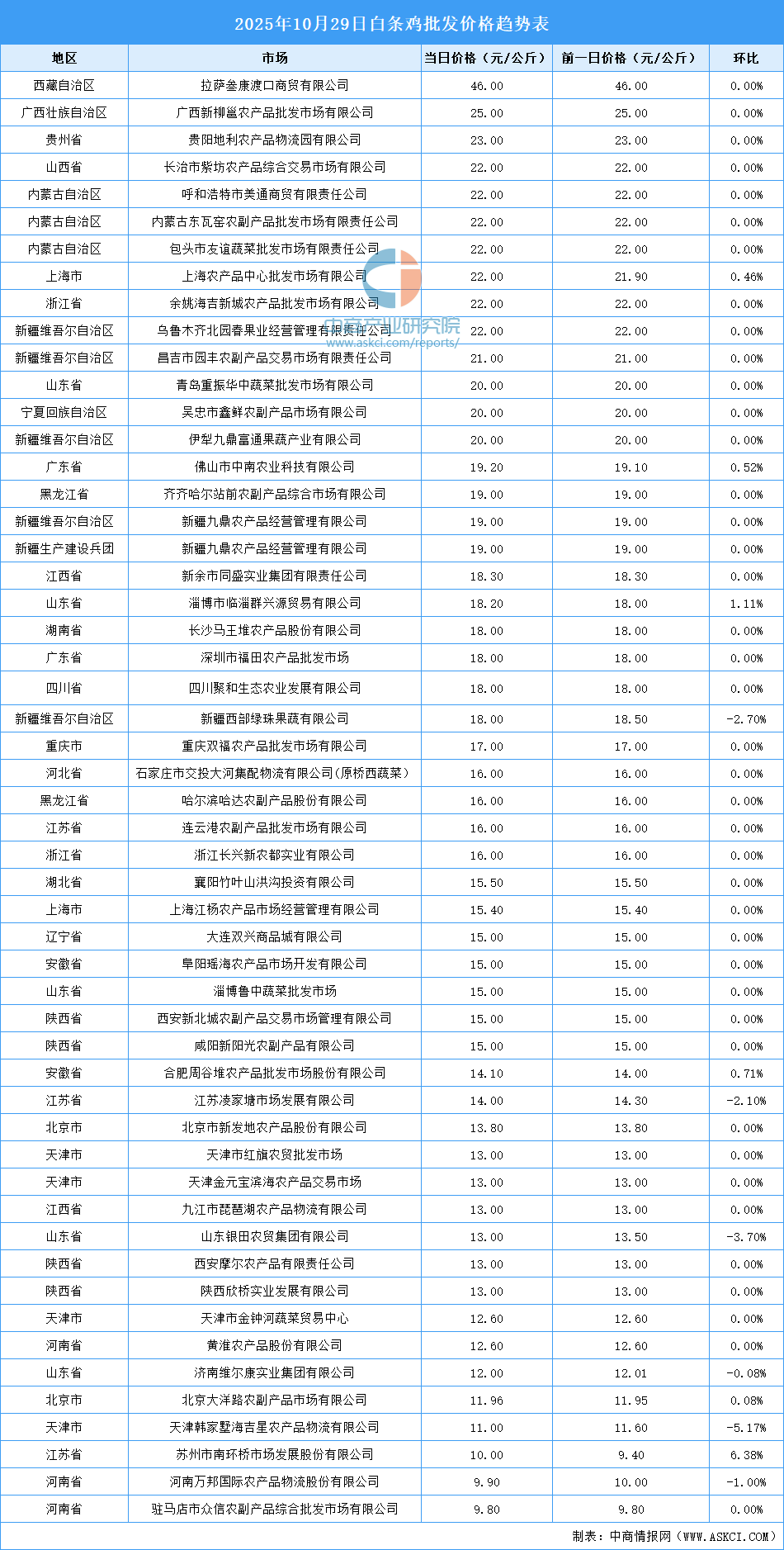 中商情報(bào)網(wǎng)訊:最新數(shù)據(jù)顯示:10月29日全國(guó)白條雞平均價(jià)格為17.18元/公斤。其中,白條雞價(jià)格最高的市場(chǎng)是拉薩叁康渡口商貿(mào)有限公司,當(dāng)日價(jià)格為46.00元/公斤,環(huán)比持平。白條雞價(jià)格最低的市場(chǎng)是駐馬店市眾信農(nóng)副產(chǎn)品綜合批發(fā)市場(chǎng)有限公司,當(dāng)日價(jià)格為9.80元/公斤,環(huán)比持平。