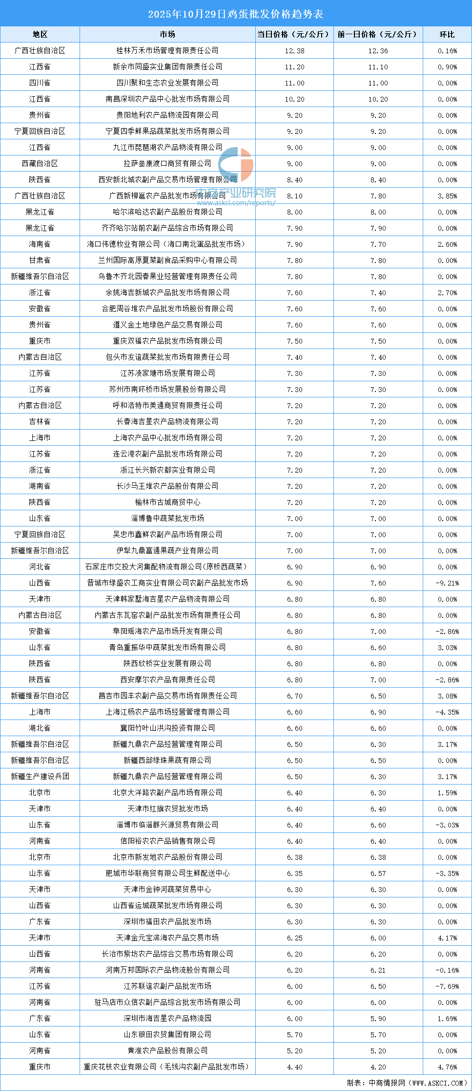 中商情報網(wǎng)訊:最新數(shù)據(jù)顯示:10月29日全國雞蛋平均價格為7.25元/公斤。其中,雞蛋價格最高的市場是桂林萬禾市場管理有限責(zé)任公司,當(dāng)日價格為12.38元/公斤,環(huán)比上漲0.16%。雞蛋價格最低的市場是重慶花枝農(nóng)業(yè)有限公司(毛線溝農(nóng)副產(chǎn)品批發(fā)市場),當(dāng)日價格為4.40元/公斤,環(huán)比上漲4.76%。
